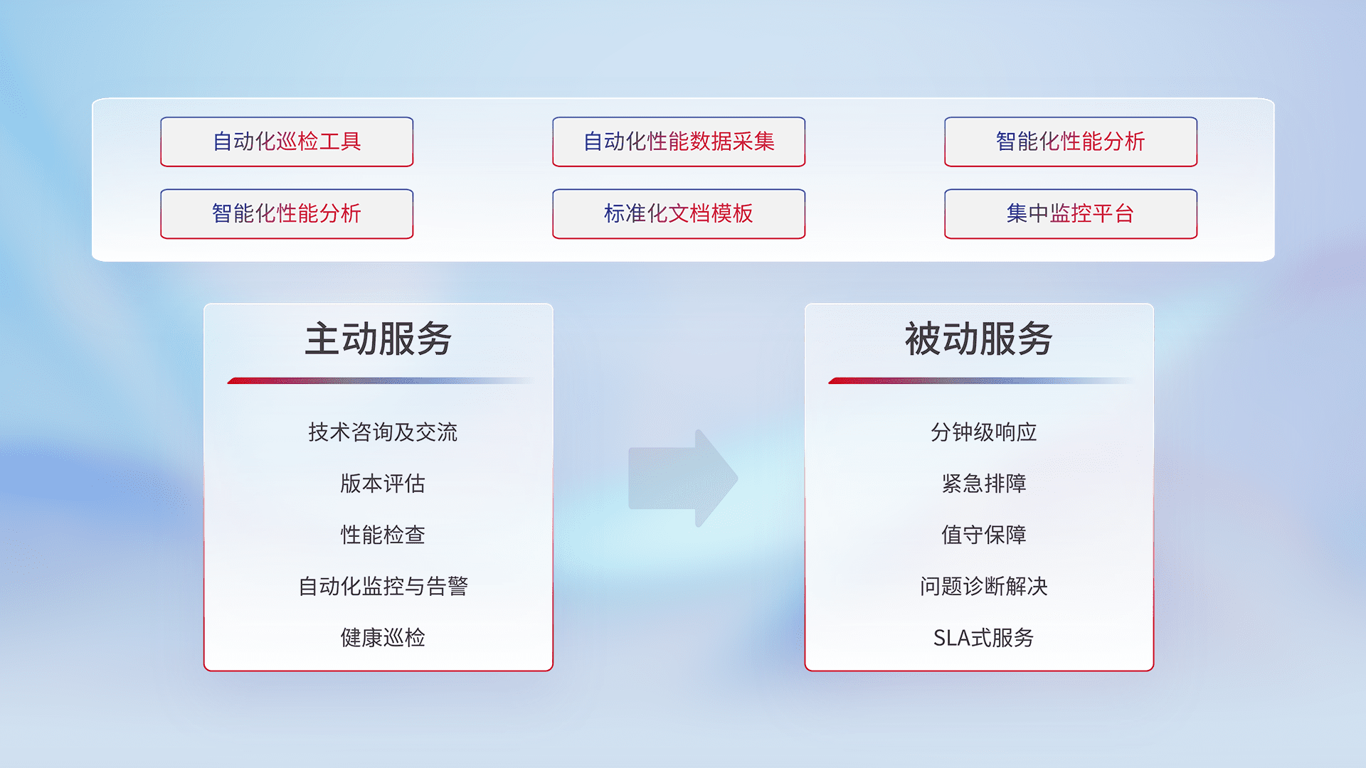 智能化工具和标准化文档,,,,保障服务质量,,提供主动服务(包含技术咨询、、、版本评估、、、性能检查、、自动化监控与告警、、、、健康巡检)和被动服务包含(分钟级响应、、、、紧急排障、、、、值守保障、、问题诊断解决、、SLA服务)。。