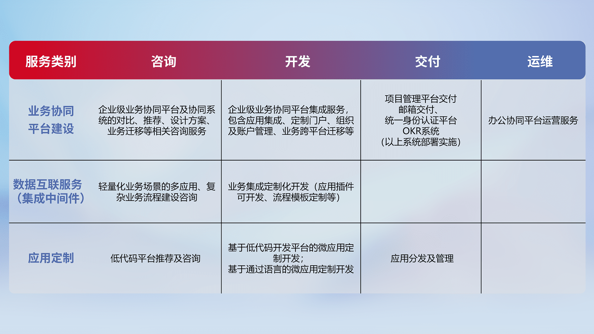 针对钉钉、、、、企微、、IDaas等平台级产品提供产品的规划、、方案、、、交付、、、、定制化开发等服务,,,实现如统一协同办公、、、、智能客户服务、、混合会议管理、、、智能数据查询、、、、等业务场景,,实现数字化转型。。。。